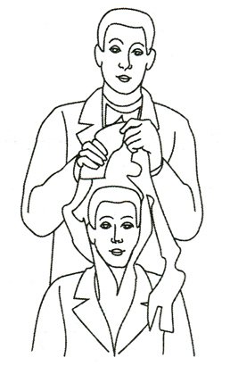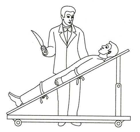 Рама и нож показаны на рисунке а. Рама надевается на шею ассистентке, чтобы голова была посередине. Руки удерживают раму с боковых сторон (рис. б) Голова накрывается шалью, и нож вдвигается дальше до упора (рис. в).