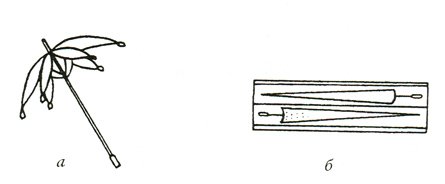 С одного зонта снят матерчатый купол, а к его спицам привязан второй комплект тонких разноцветных платков. В сложенном виде такой зонт с самого начала находится в одной части трубки-футляра (рис. б).