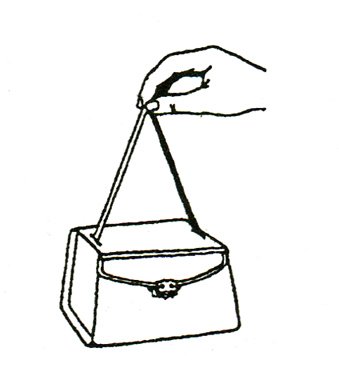 Шесть сумочек складываются и кладутся в мешок из черной материи или связываются резиновым кольцом и образуют маленькую пачку, легко помещающуюся в шляпе.