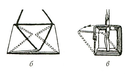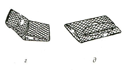 Углы сделаны из мягкой кожи. Сжимая бока в направлении, указанном линиями на рис. в, сумочка принимает форму как на рис. г, а будучи опять сложенной, как на рис. д, она станет немного больше карманной записной книжки.