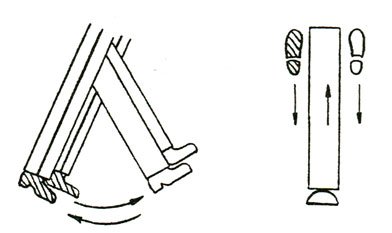 Далее ваша правая рука с «волшебной палочкой» отводится в сторону, а потом палочка подводится снизу к шляпе и направляется в то отверстие между полями шляпы, которое образовано при помощи левой руки, захватившей шляпу изнутри. От этого левая рука получила возможность захватить и какое-то время удерживать вдвинутую палочку. Отпустив правой рукой палочку снизу, вы подводите к ней же правую руку сверху, захватываете ее и вводите вертикально вверх (рис.).