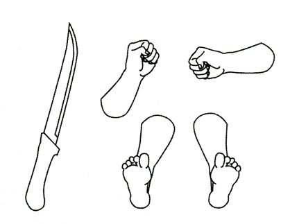 Для демонстрации фокуса требуется складная платформа (ее легко транспортировать) на колесиках с поднимающейся под большим углом верхней крышкой, а также муляжи конечностей — части рук (от локтей) и ног (от колен), либо сделанных из легкого дерева, либо отлитых из пластика и выкрашенных в телесный цвет. На рисунке показан примерный вид ножа.