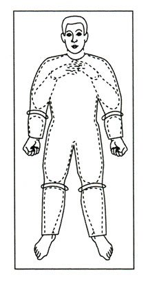 При «отсечении» конечностей тела на самом деле лезвие ножа будет опускаться между канатами и верхними частями муляжей, скрытых в ткани комбинезона. Перед каждым «отсечением» закатывайте рукава и штанины комбинезона до канатов (до локтей и колен человека).