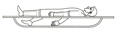Одетый в комбинезон человек ложится на плоскость платформы головой к приподнятой стороне. Его руки, согнутые в локтях (кисти касаются предплечий), и ноги, согнутые в коленях (ступни касаются таза), обматываются канатами, которые прикрепляются к доске.