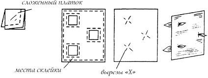 СЕКРЕТ ФОКУСА. Прежде всего надо иметь два одинаковых газетных листа. Тонкие платки складываются в два раза и накладываются в разных частях листа. По краям они обводятся карандашом. Платки затем убираются, а в местах, соответствующих месту, где были кончики платка, острой бритвой делаются крестообразные надрезы.