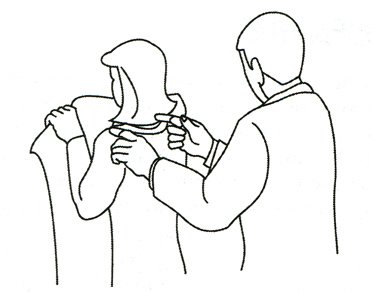 В верхнем правом углу платка была приколота булавка. Угол платка вместе с булавкой маскировала ваша правая рука. Показывая платок со всех сторон, чтобы убедить зрителей, что платок секретов не имеет, движением булавки приколите платок к левому плечу пиджака. Это освободит вашу правую руку, которая и должна позвонить в колокольчик под прикрытием платка. Далее рука немедленно возвращается в исходное положение, и платок снимается с плеча (рис.).