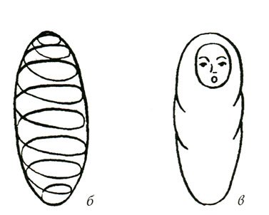 Каждый чехол оформляется красками «под завернутого в пеленку ребенка», делается путем аппликации его лицо. Нос, например, можно приклеить из кусочка поролона (рис. в). Уже с расстояния нескольких метров такая имитация должна казаться зрителям настоящим запелёнатым младенцем.