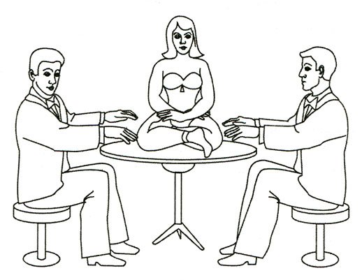 При отрыве рук от стола трубки упираются снизу в крышку стола, и два человека с легкостью поднимают стол вместе с сидящей на нем женщиной. Со стороны приспособления незаметны.
