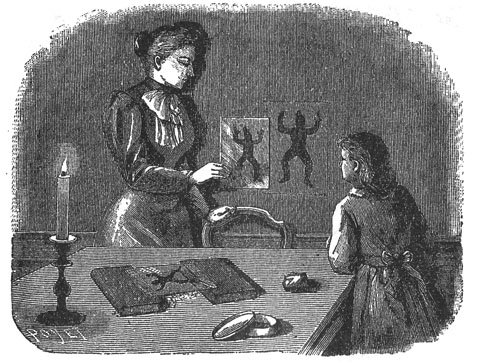 А вот и фокус. Нарисуйте на стекле глицерином какую-нибудь фигуру и, поместив стекло между свечей и стеной, которая будет служить экраном, покажите публике, что оно совершенно прозрачно. Положите потом стек-ло на книги и наэлектризуйте его трением.