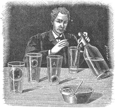 Когда таким образом вся вода из стакана и сифона будет выпита, останется невидимая для глаза углекислота, которая не улетучится из стакана, так как она почти вдвое тяжелее воздуха. Все же стакан не помешает прикрыть блюдцем.