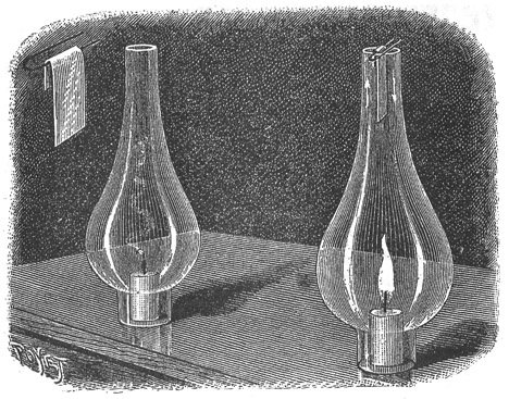 В этом не трудно убедиться: поднесите к краю колбы горящую спичку. Пламя ее с одной стороны будет притягиваться внутрь, в колбу, а с другой — будет отталкиваться выходящей струей воздуха. В этом случае свеча будет гореть спокойным ярким пламенем.