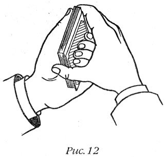 Затем большим и средним пальцами правой руки (рис. 12) захватите с боков ту часть карт, которая теперь составляет середину колоды и перекладывайте их кучками по пять или шесть карт на лицевую сторону карт, остающихся в левой руке, отодвигая в сторону большой палец для того, чтобы дать им проход.