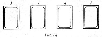 Держите карты крапом вверх на 3—5 см от стола и роняйте, по пять или шесть одновременно, те карты, которые теперь образуют нижнюю половину колоды. Вы должны устроить так, что-бы эти карты легли четырьмя маленькими кучками, падая и порядке, указанном цифрами (рис. 14).