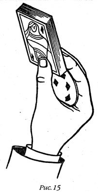 Не следует показывать, что вы хотите удержать карту, которая лежит теперь согнутая на вашей ладони. Напротив, нужно или беззаботно опустить руку сбоку, или держать колоду между большим и остальными пальцами той же руки (рис. 15) и предложить ее стасовать.
