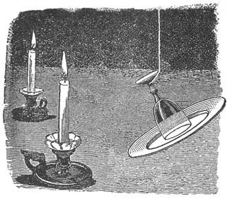 Если вы пожелаете, чтобы ламповое стекло само по себе двигалось и опускалось вниз по натянутой веревочке, то возьмите крепкую тонкую веревку и две круглые пробки, равного диаметра с отверстиями стекла. Вот и все приспособления для этого довольно затейливого опыта.