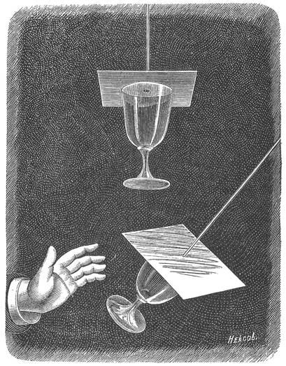 Вот применение этого закона: надо продеть ниточку сквозь середину того картона, которым прикрывают рюмку, закрепив ее изнутри узелком. Кроме того дырочку, сквозь которую пропущена нитка, нужно залепить воском, чтобы воздух никак не мог проникать в рюмку.