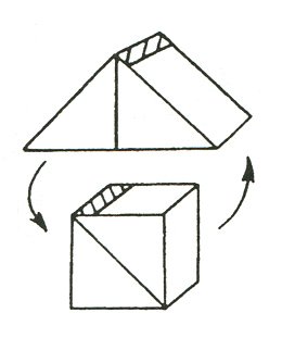 Если желтые половинки сложить кубиком, а сверху поставить на него вывернутые в противоположную сторону красные половинки, получится сооружение, со стороны напоминающее домик с желтой коробкой — основанием и с красной крышей (рис.).