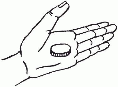 При сжимании руки в кулак в ладони образуется «ямка», и монетка в ней займет вертикальное положение. В этом положении и зажмите ее пальцами сверху.