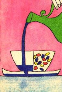 Из тонкой жести вырежьте пиалу и покрасьте белой масляной краской или эмалью в 2-3 слоя. Из зрительного зала она будет казаться фарфоровой. Внутри сосуда клеем БФ-2 вклейте перегородку, покрашенную в тот же цвет. В левой части дна пиалы просверлите отверстие диаметром 6-8 мм. В правую половину положите горсть конфетти. Поднос двойной, с отверстием тоже диаметром 6-8 мм на крышке. Еще одно отверстие диаметром 4 мм сделайте в борту подноса: через него из подноса будет выходить воздух, уступая место воде.