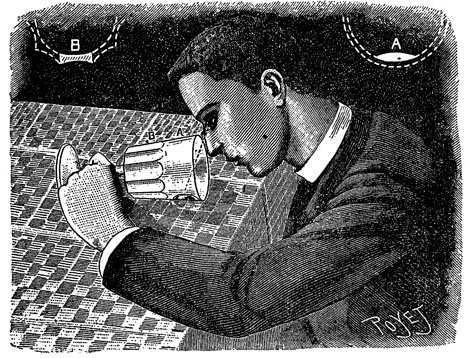 Та же капля на одной из граней рюмки, как видно из рисунка В, принимает форму двояко-вогнутой или плоско-вогнутой линзы, если грань прямая. Если вы через такую каплю посмотрите на квадраты скатерти, то заметите, что они кажутся много мельче, чем они на самом деле. Вот почему дальнозоркие носят очки с двояко-выпуклыми линзами с тонкими краями, а близорукие — с двояко-вогнутыми линзами с толстыми краями.