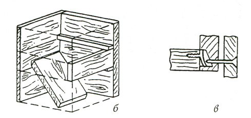 Секрет исчезновения первой нитки бус кроется в устройстве ящика и коробки (рис. б). Дно ящика приклеено полоской материи к его передней стенке. На заднем торце дна имеется металлическая пластинка-защелка, а внизу по задней стенке ящика проходит небольшой бортик, за который заходит защелка. На этом же уровне в задней стенке ящика просверлено небольшое отверстие, в которое входит гвоздик-шпилька: он крепится на этом же уровне к задней стенке коробки (рис.).