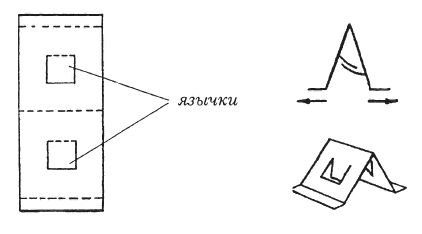 Для этого фокуса необходимо приготовить полоску из плотной бумаги. Пунктиром на этом рисунке обозначены линии сгиба, сплошными линиями показаны линии разреза. На один из бумажных язычков следует наклеить фотографию, которая должна будет исчезнуть.