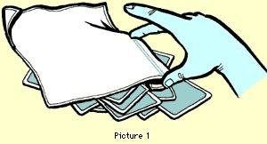 Вы берете колоду карт, кладете на стол и немного смешиваете, сделав небольшую кучку. Накрываете ее носовым платком и через платок поднимаете одну карту так, чтобы она оказалась скрыта от зрителя. Теперь взмахните платком… Карта исчезла!