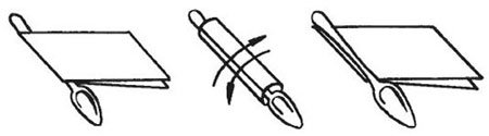 Если бы вы развернули трубочку точно так же, «только наоборот», ложка так бы и осталась между листками. Чтобы она оказалась снаружи — поверх сложенного вдвое листка, — начиная разворачивать трубку, вначале разверните только один из листков — нижний — на полный оборот, а далее разворачивайте вместе оба листка. Со стороны это практически не бросается в глаза. Поэтому-то ложка и оказывается на своем прежнем месте, но не между листками, что должно быть на самом деле, а на них.