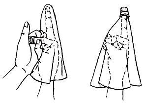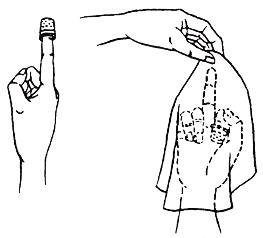 Покажите зрителям пальцы правой руки. Затем четыре пальца, кроме указательного, сожмите в кулак, а указательный — с надетым наперстком — оставьте выпрямленным. Левой рукой возьмите платок и накройте палец с наперстком. Когда вы отстраните левую руку, зрители увидят, что наперсток теперь надет на палец поверх платка.