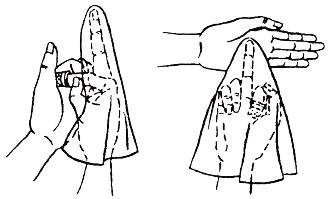 Показав это зрителям, проделайте движения в обратной последовательности. Снимите наперсток, зажмите его подушечкой большого пальца левой руки и, скользя по платку раскрытой ладонью левой руки, покажите зрителям, что наперсток исчез с поверхности платка. А так как пальцы левой руки вытянуты и раскрыты, зрители и не подумают, что наперсток может быть спрятан в ней.