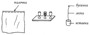 Секрет фокуса: Нужны три обыкновенные рюмки и поднос — пластина из оргстекла. Секрет — во вставке из дерева, окрашенной в красный цвет. К середине вставки крепится леска.