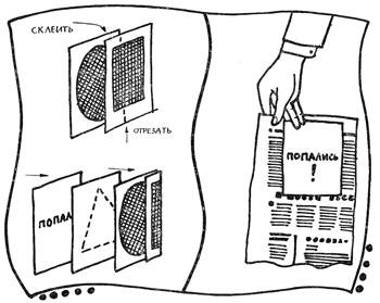 Показав зрителям три картонки: круг, квадрат и треугольник,— сложите их в стопку и оберните полосой газетной бумаги длиной 90 см и шириной 24 см. Следите за тем, чтобы зрители случайно не увидели заднюю картонку, на которой написано «Попались!». Затем на глазах у зрителей начинайте вытаскивать картонки из пакета. При этом необходимо точно знать, как они расположены в пакете. Например, вы хотите вынуть картонку с квадратом. Как известно, вторая сторона этой картонки составлена из половинок круга и квадрата. Поэтому, вынимая ее, надо быть уверенным в том, что ее составная сторона не обращена к зрителям.