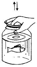 Покажите стеклянную банку, затянутую резиновой крышкой и наполненную водой на три четверти объема. В воде плавает пластмассовая рыбка.