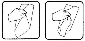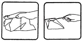 Секрет фокуса: Выньте из кармана подготовленный платок и расстелите его перед собой на столе. Угол, у которого вшита проволока, должен быть направлен к зрителям. Начиная с этого угла, сложите платок таким образом, чтобы образовался «карман», открытый с вашей стороны.