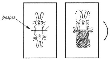 Секрет фокуса: Изготавливается картинка с изображением головы зайца и ее зеркальное изображение. В середине делается тонкая прорезь, через которую будет протягиваться одна из цветных полосок материи.