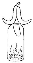 Поставьте на стол стеклянную бутылку с широким горлышком. Подожгите листок бумаги и бросьте его, еще горящий, в бутылку. Тут же заткните горлышко бутылки открытой частью банана, отогнув кожицу на его кончике так, чтобы она осталась снаружи.