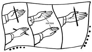 В край подкладки рукава со стороны ладони пришивается пуговичка. Отрезок капроновой нитки надо сложить вдвое и связать концы узелком. Получится петля. Одна сторона петли, где узелок, надевается на пуговицу. Петлю надо обмотать вокруг пуговицы один-два раза, чтобы она не соскочила во время демонстрации фокуса. Вторая сторона петли надевается на средний палец. Такая нитка совершенно незаметна зрителю даже на очень близком расстоянии. Это обстоятельство и дает возможность демонстрировать фокус.