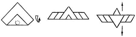 Затем начните сворачивать платок — по стрелке, показанной на этом же рисунке, то есть в направлении «от себя — под платок». Окончательное положение свернутого платка показано на среднем рисунке. Эту трубочку-платок поверните на 180 градусов вокруг вертикальной оси трубочки-платка.