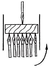 С одной стороны грани воткнуто около десятка перьев. Они находятся внутри «кубика», поэтому их не видно. Воткнув одно перо на видимую сторону этой грани, под прикрывающим платком продвиньте пальцами подвижную грань на другой конец. Поверните кубик и отбросьте платок — перед зрителями предстанет целый десяток перьев.