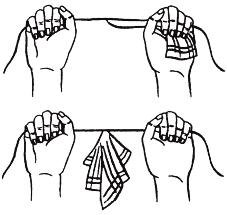 Секрет фокуса. К веревке прикреплена тонкая резинка. Пришить ее нужно так, чтобы она не провисала, когда веревка будет натянута. Веревка и резинка, конечно, должны быть одного цвета. На резинку заранее крепится платок. Перед демонстрацией фокуса ассистент натягивает веревку вместе с резинкой, а второй платок зажимает в руке.