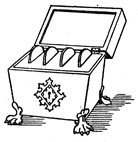 Это ящик, обитый кожей, от 5 до 7 см шириной и 5 см высотой. Когда он открыт, то видно, что внутри него находится бархатная стеганая подушка, как шкатулочка для перстней, с четырьмя разрезами, достаточно широкими для того, чтобы пропустить монету.