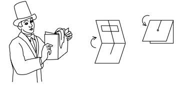 Три картонки — три платка. Перед демонстрацией журнал «заряжается», а в фокусе, когда вы будете листать страницы, картонка открывается и появляется конец платка, который затем вытягивается из-под полоски.