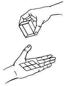 Как только металлическая пластинка выпадет в ящичек, поверните ладонь ящичком вверх. Уберите его с ладони и покажите зрителям выпавшую из него «шоколадку», в которой они не обнаружат никакого отверстия, сквозь которое могла бы пройти иголка с ниткой.
