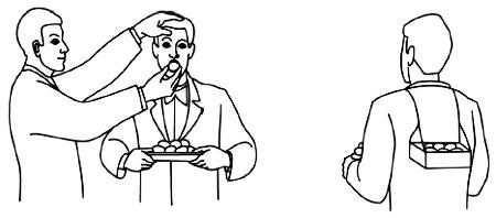 В руках вашего ассистента — большое блюдо. Взяв в руки «волшебную палочку», вы дотрагиваетесь ею до его рта. Изо рта ассистента показывается яйцо. Положив палочку в карман, вы берете яйцо левой рукой, кладете его на блюдо и становитесь по правую сторону ассистента, во рту которого опять показывается яйцо.