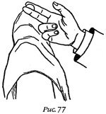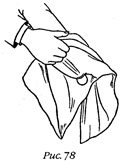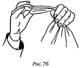 Правой рукой ладонью вверх возьмите монету сквозь платок (как показано на рис. 77), между указательным и средним пальцами этой руки.